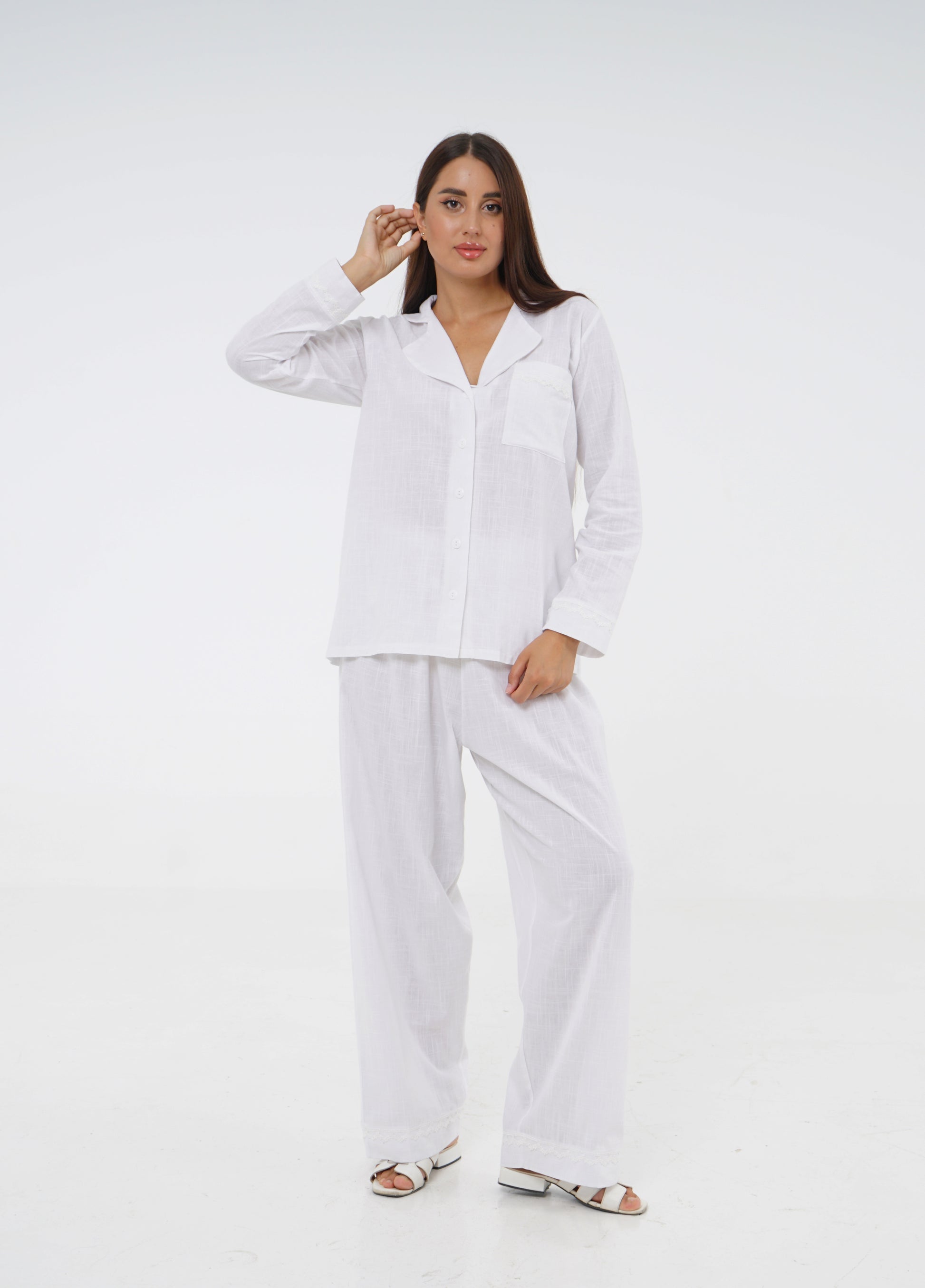 Boost your loungewear with this elegant white linen pajama set, designed for comfort and refined style. Crafted from breathable, lightweight linen, this set features a relaxed-fit button-down top with a classic collar, a single chest pocket, and long sleeves with cuff detailing. The wide-leg pants with a comfortable elastic waistband, ideal for day-to-night ease.
